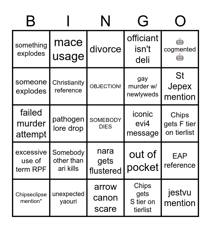 This bingo card has a free space and 24 words: Somebody other than ari kills, unexpected yaouri, OBJECTION!, Chipseclipse mention*, 🤖cogmented🤖, something explodes, someone explodes, mace usage, iconic evi4 message, nara gets flustered, gay murder w/ newlyweds, failed murder attempt, out of pocket, EAP reference, Christianity reference, Chips gets S tier on tierlist, Chips gets F tier on tierlist, divorce, St Jepex mention, pathogen lore drop, jestvu mention, excessive use of term RPF, officiant isn't deli and arrow canon scare.