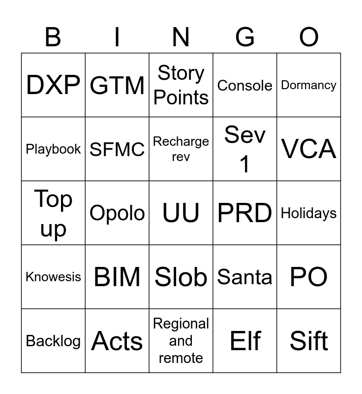 This bingo card has a free space and 24 words: BIM, Acts, Recharge rev, Backlog, Dormancy, DXP, Playbook, GTM, PRD, Slob, Sev 1, Top up, Santa, PO, SFMC, Elf, Holidays, Story Points, VCA, Opolo, Sift, Knowesis, Console and Regional and remote.