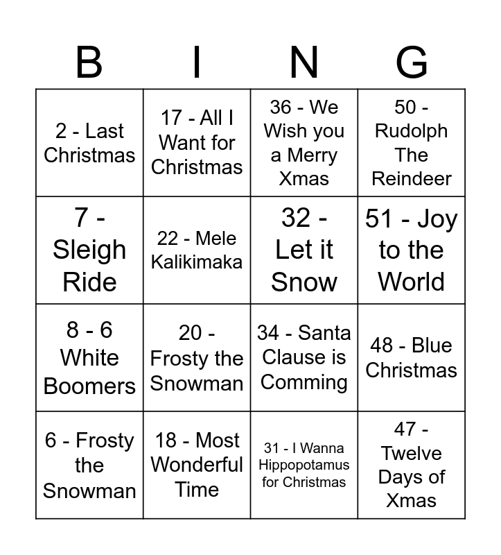 This bingo card has 30 words: 1 - Feliz Navidad, 16 - Grandma Got Run Over by a Reindeer, 31 - I Wanna Hippopotamus for Christmas, 46 - It's Beginning to Look A lot Like, 2 - Last Christmas, 17 - All I Want for Christmas, 32 - Let it Snow, 47 - Twelve Days of Xmas, 3 - Home for the Holidays, 18 - Most Wonderful Time, 33 - Mr. Grinch, 48 - Blue Christmas, 4 - Rockin Around the Xmas Tree, 19 - The Season's Upon Us, 34 - Santa Clause is Comming, 49 - Wonderful Christmas, 5 - The First Noel, 20 - Frosty the Snowman, 35 - Mary's Boy Child, 50 - Rudolph The Reindeer, 6 - Frosty the Snowman, 21 - Jingle Bell Rock, 36 - We Wish you a Merry Xmas, 51 - Joy to the World, 7 - Sleigh Ride, 22 - Mele Kalikimaka, 37 - Run, Run, Rudolph, 52 - Santa Baby, 8 - 6 White Boomers and 23 - Let it Go.