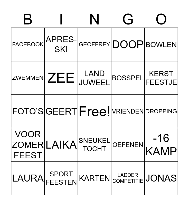 This bingo card has a free space and 82 words: SARAH, LEIDING, GEOFFREY, LEDEN, INSTAGRAM, ATLETIEK, NIELS, MEISJES, NICK, LOKAAL, THOMAS, VOETBAL, ZEE, VRIENDEN, ASTRID, FACEBOOK, LAURA, ZWEMMEN, LIESBETH, DORPSPEL, SNAPCHAT, BOSSPEL, JONAS, BOWLEN, GEERT, ACTIVITEIT, VOLLEYBAL TORNOOI, VRIJDAG, MICHIEL, ZONDAG, LAIKA, GEWEST, FOTO’S, KLJ-LIED, MOSSEL FESTIJN, KARTEN, NIGHT OF PASSION, PAINTBALL, KERST FEESTJE, KLJ-SITE, STARTDAG, DOOP, EINDREIS, SINT, -10, APRES-SKI, -16, LAND JUWEEL, +16, JEUGD BEWEGING, CEDRIC, DROPPING, SPORT FEESTEN, TOUW TREKKEN, VENDELEN, BEKERS, WIMPELEN, BORN 2B WILD, DANSEN, OEFENEN, PIRAMIDE, NAZOMER FEEST, VOOR ZOMER FEEST, TONEEL, KLJ BEVEREN, UNIFORM, 2B, HALLOWEEN TOCHT, WATER SPELLEKES, MEIKERMIS, HALVE LITER, STREEK BIEREN AVOND, SNEUKEL TOCHT, LADDER COMPETITIE, KRUIS DAGEN, KAMPDANS, SJAALTJE, BLOEMEKES VERKOOP, JONGENS, +16 KAMP, -16 KAMP and KAAS-& WIJNAVOND.