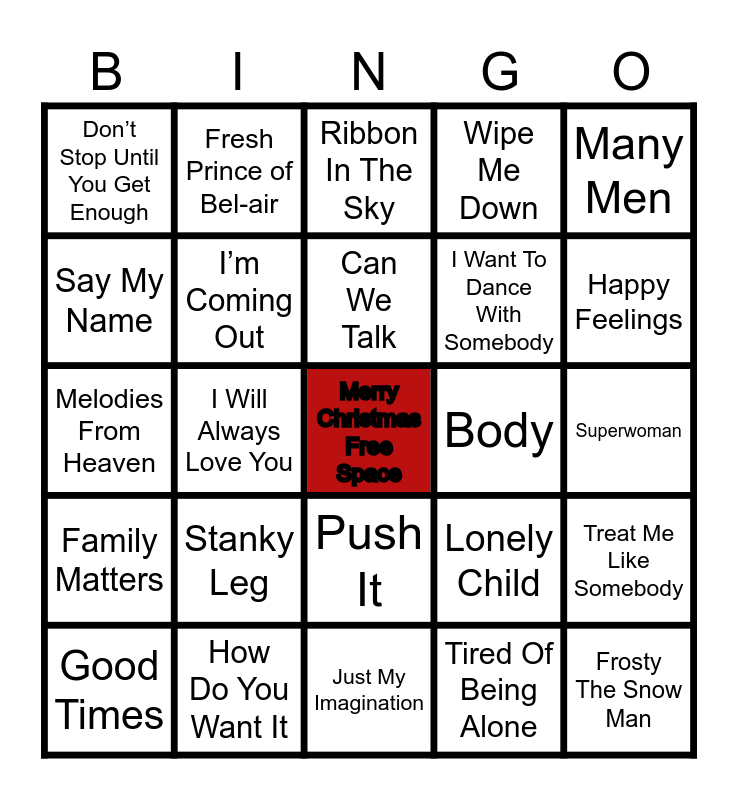 This bingo card has a free space and 28 words: Treat Me Like Somebody, Let It Go, I Want To Dance With Somebody, Tired Of Being Alone, Say My Name, Ribbon In The Sky, Fresh Prince of Bel-air, Family Matters, Body, Good Times, Melodies From Heaven, Wipe Me Down, How Do You Want It, Just My Imagination, Happy Feelings, Today Was A Good Day, Stanky Leg, I’m Coming Out, Can We Talk, Push It, Don’t Stop Until You Get Enough, Papa was a Rollin Stone, Frosty The Snow Man, I Will Always Love You, Superwoman, Lonely Child, Many Men and Just kicking it.