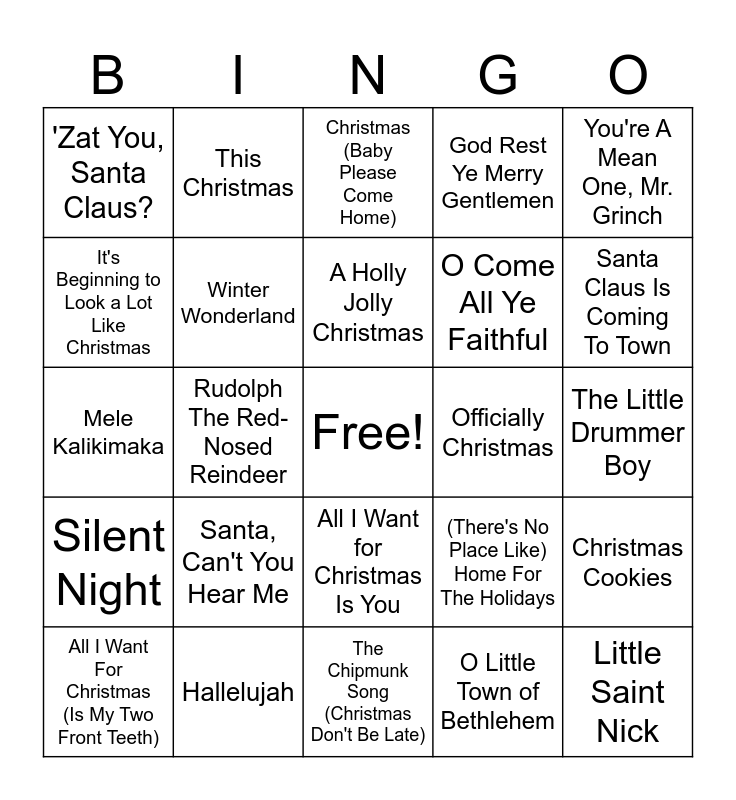 This bingo card has a free space and 75 words: Jingle Bell Rock, Rockin' Around The Christmas Tree, Christmas (Baby Please Come Home), It's the Most Wonderful Time of the Year, Sleigh Ride, The Christmas Song (Merry Christmas To You), White Christmas, Feliz Navidad, Let It Snow! Let It Snow! Let It Snow!, Run Rudolph Run, Santa Baby, Blue Christmas, A Holly Jolly Christmas, It's Beginning to Look a Lot Like Christmas, Have Yourself A Merry Little Christmas, Rudolph The Red-Nosed Reindeer, I Want a Hippopotamus for Christmas, Little Saint Nick, Jingle Bells, You're A Mean One, Mr. Grinch, Here Comes Santa Claus, Mele Kalikimaka, Winter Wonderland, This Christmas, God Rest Ye Merry Gentlemen, Deck The Hall, (Everybody's Waitin' For) The Man With The Bag, Frosty the Snowman, Caroling, Caroling, Do You Hear What I Hear?, Happy Holiday/The Holiday Season, Merry Christmas Darling, Silver Bells, (There's No Place Like) Home For The Holidays, Santa Claus Is Coming To Town, O Come All Ye Faithful, My Favourite Things, The First Noel, The Little Drummer Boy, O Little Town of Bethlehem, Baby, It's Cold Outside, I'll Be Home For Christmas, Joy To The World, Mistletoe And Holly, I Saw Mommy Kissing Santa Claus, O Christmas Tree, All I Want For Christmas (Is My Two Front Teeth), 'Zat You, Santa Claus?, Twelve Days Of Christmas, Hark! The Herald Angels Sing, O Holy Night, All I Want for Christmas Is You, Last Christmas, Santa Tell Me, Underneath the Tree, Snowman, Carol of the Bells, You Make It Feel Like Christmas, Mistletoe, Christmas Tree Farm, Santa, Can't You Hear Me, What Christmas Means to Me, Merry Christmas, Happy Holidays, 8 Days of Christmas, Holiday Road, Officially Christmas, Up on the House Top, Away In A Manger, Go Tell It On The Mountain, Christmas Cookies, Silent Night, Hallelujah, Mary, Did You Know?, The Chipmunk Song (Christmas Don't Be Late) and Candy Cane Lane.