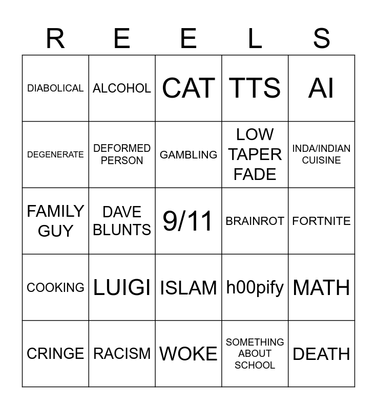This bingo card has a free space and 24 words: LUIGI, RACISM, GAMBLING, CRINGE, AI, DIABOLICAL, DEGENERATE, ALCOHOL, BRAINROT, ISLAM, LOW TAPER FADE, FAMILY GUY, h00pify, MATH, DEFORMED PERSON, SOMETHING ABOUT SCHOOL, FORTNITE, CAT, INDA/INDIAN CUISINE, DAVE BLUNTS, DEATH, COOKING, TTS and WOKE.