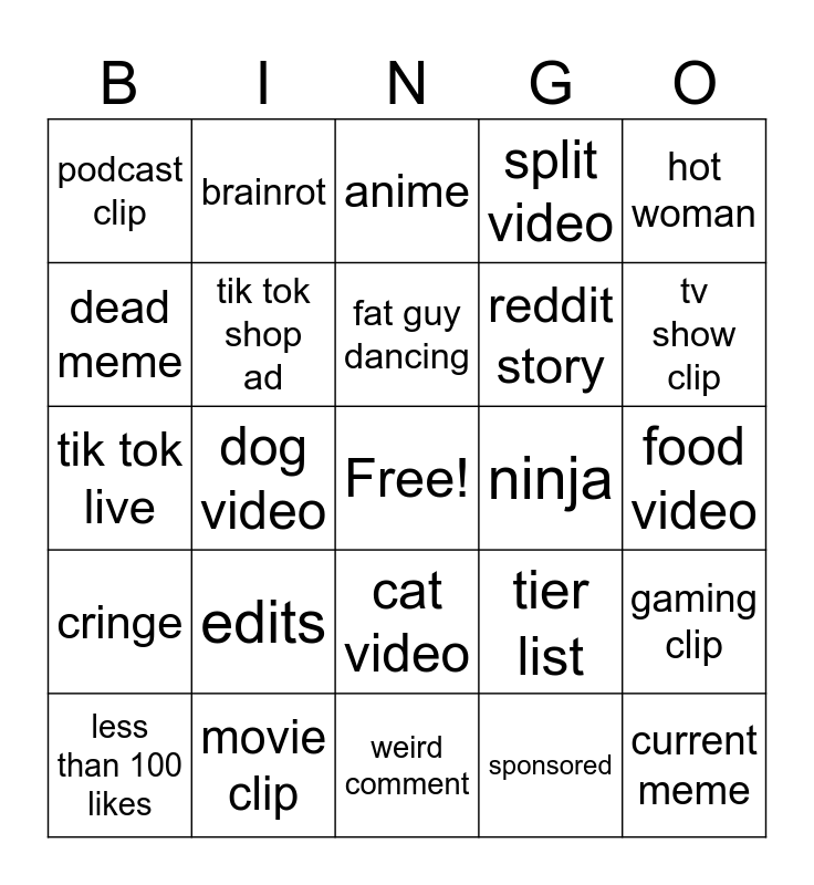 This bingo card has a free space and 24 words: edits, movie clip, fat guy dancing, less than 100 likes, hot woman, podcast clip, dead meme, brainrot, ninja, cat video, reddit story, tik tok live, tier list, gaming clip, tik tok shop ad, sponsored, food video, anime, tv show clip, dog video, current meme, cringe, split video and weird comment.