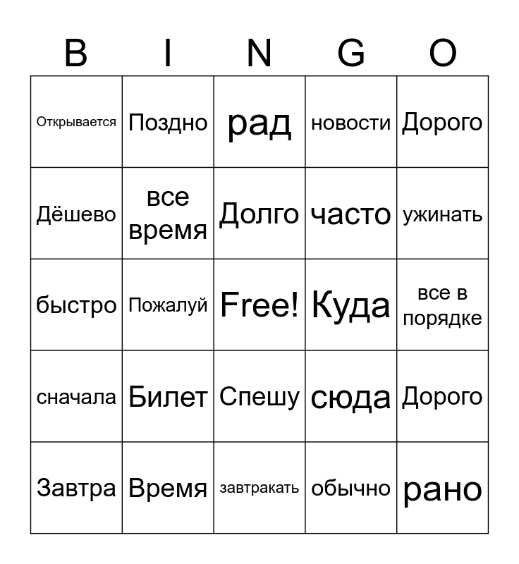 This bingo card has a free space and 24 words: Билет, Время, Долго, Завтра, Дорого, Открывается, Дёшево, Поздно, Куда, Спешу, часто, быстро, сюда, Дорого, все время, обычно, все в порядке, рад, ужинать, Пожалуй, рано, сначала, новости and завтракать.