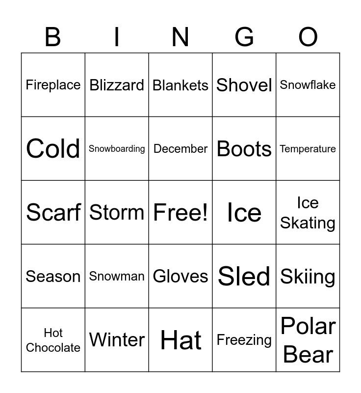 This bingo card has a free space and 24 words: Snowman, Winter, December, Hot Chocolate, Snowflake, Fireplace, Cold, Blizzard, Ice, Gloves, Boots, Scarf, Sled, Skiing, Snowboarding, Freezing, Ice Skating, Blankets, Temperature, Storm, Polar Bear, Season, Shovel and Hat.