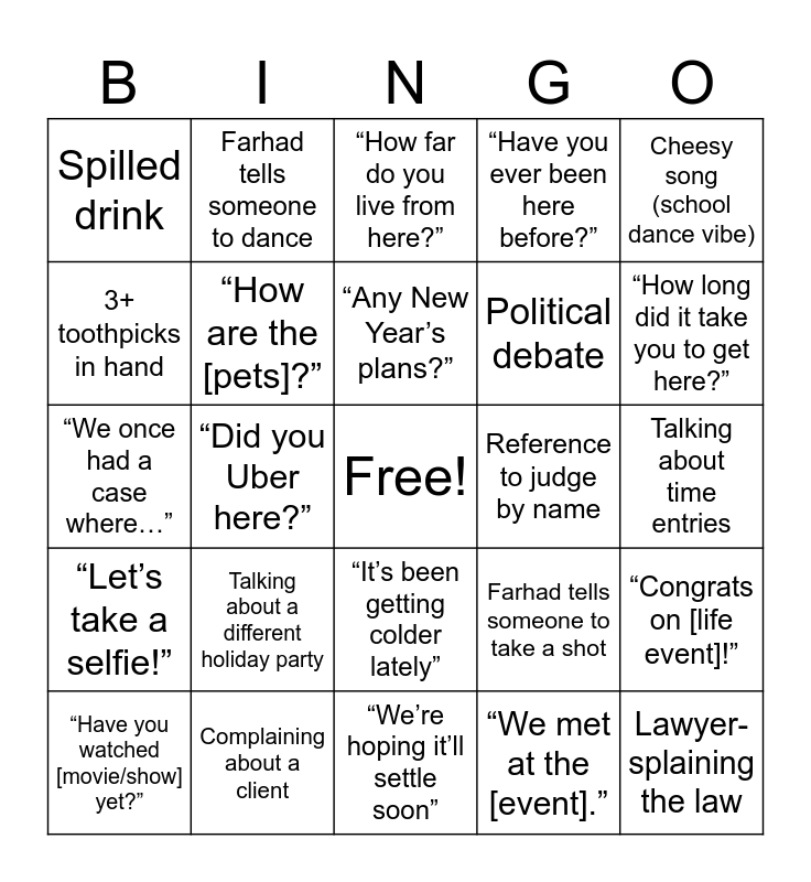This bingo card has a free space and 24 words: Talking about a different holiday party, Complaining about a client, “Any New Year’s plans?”, “Have you watched [movie/show] yet?”, Cheesy song (school dance vibe), Spilled drink, 3+ toothpicks in hand, Farhad tells someone to dance, Reference to judge by name, “It’s been getting colder lately”, Political debate, “We once had a case where…”, Farhad tells someone to take a shot, “Congrats on [life event]!”, “How are the [pets]?”, “We met at the [event].”, Talking about time entries, “How far do you live from here?”, “How long did it take you to get here?”, “Did you Uber here?”, Lawyer-splaining the law, “Let’s take a selfie!”, “Have you ever been here before?” and “We’re hoping it’ll settle soon”.