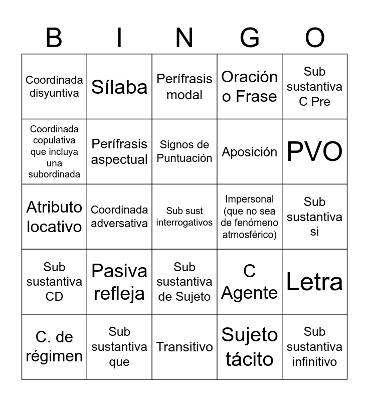 This bingo card has a free space and 29 words: C. de régimen, CLA, Coordinada adversativa, Coordinada copulativa, Coordinada disyuntiva, Perífrasis modal, Perífrasis aspectual, Pasiva refleja, Impersonal (que no sea de fenómeno atmosférico), Sub sustantiva que, Sub sustantiva si, Sub sustantiva infinitivo, Transitivo, Sujeto tácito, PVO, Atributo, Sub sustantiva de Sujeto, Sub sustantiva CD, Sub sustantiva C Pre, Atributo locativo, C Agente, Locución verbal, Aposición, Coordinada copulativa que incluya una subordinada, Oración o Frase, Sílaba, Letra, Signos de Puntuación and Pronombre Demostrativo.