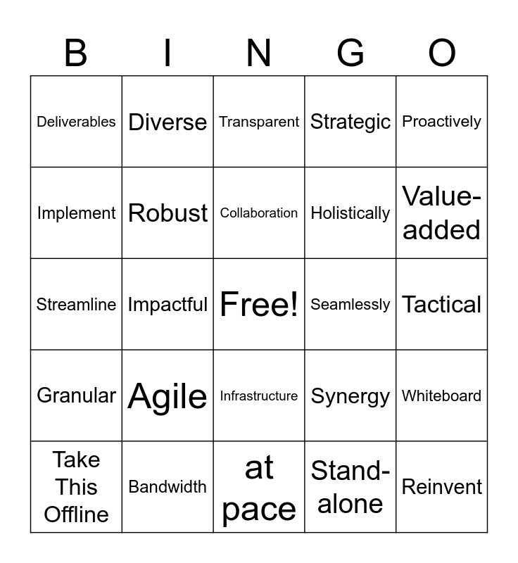 This bingo card has a free space and 24 words: Agile, Bandwidth, Collaboration, Take This Offline, Proactively, Deliverables, Implement, Diverse, Seamlessly, Infrastructure, Holistically, Streamline, Synergy, Whiteboard, Robust, Stand-alone, Tactical, Transparent, Value-added, Impactful, Reinvent, Granular, Strategic and at pace.