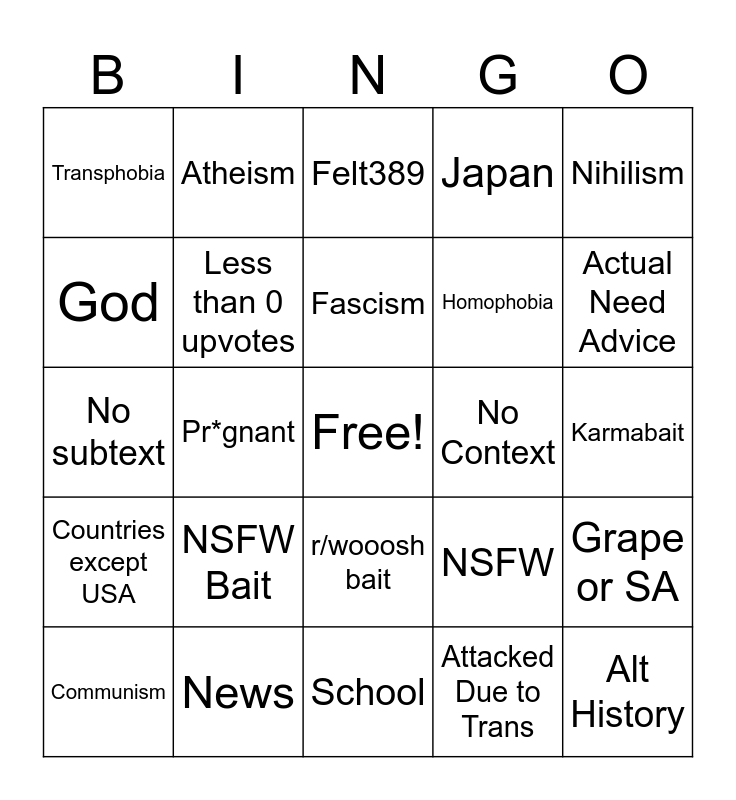 This bingo card has a free space and 24 words: NSFW Bait, News, Fascism, Communism, Nihilism, Transphobia, God, Atheism, No Context, r/wooosh bait, Homophobia, No subtext, NSFW, Grape or SA, Less than 0 upvotes, Attacked Due to Trans, Karmabait, Felt389, Actual Need Advice, Pr*gnant, Alt History, Countries except USA, Japan and School.