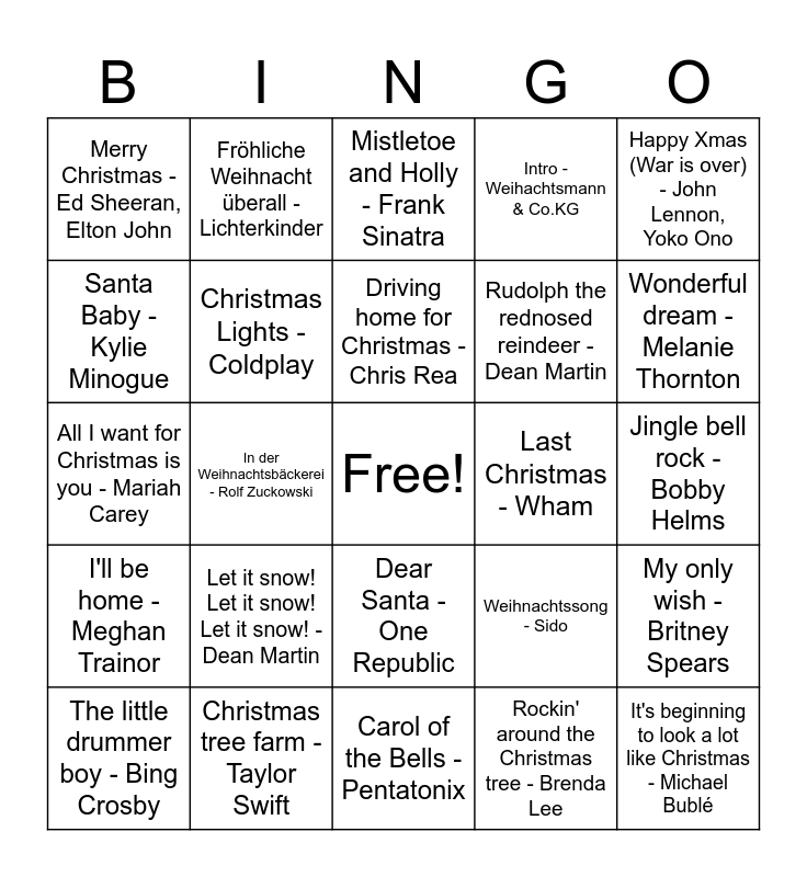 This bingo card has a free space and 40 words: All I want for christmas is New Year's day - Hurts, All I want for Christmas is you - Mariah Carey, Blue Christmas - Elvis Presley, Christmas Lights - Coldplay, Christmas tree farm - Taylor Swift, Dear Santa - One Republic, Driving home for Christmas - Chris Rea, Feliz Navidad - José Feliciano, Happy Xmas (War is over) - John Lennon, Yoko Ono, I'll be home - Meghan Trainor, In der Weihnachtsbäckerei - Rolf Zuckowski, Intro - Weihachtsmann & Co.KG, It's beginning to look a lot like Christmas - Michael Bublé, Jingle bell rock - Bobby Helms, Last Christmas - Wham, Let it snow! Let it snow! Let it snow! - Dean Martin, Like it's Christmas - Jonas Brothers, Merry Christmas - Ed Sheeran, Elton John, Mistletoe - Justin Bieber, Mistletoe and Holly - Frank Sinatra, My only wish - Britney Spears, Rockin' around the Christmas tree - Brenda Lee, Rudolph the rednosed reindeer - Dean Martin, Santa Baby - Kylie Minogue, Santa Claus is coming to town - The Jackson 5, Santa tell me - Ariana Grande, Shake up Christmas - Train, Snowman - Sia, Stille Nacht, heilige Nacht - Dresdner Kreuzchor, The best side of live - Sarah Connor, The Christmas Song - Nat King Cole, The little drummer boy - Bing Crosby, Underneath the tree - Kelly Clarkson, Weihnachtssong - Sido, Wonderful dream - Melanie Thornton, Carol of the Bells - Pentatonix, Thats Christmas to me - Pentatonix, Deck the hall - Pentatonix, Fröhliche Weihnacht überall - Lichterkinder and Merry Christmas everyone - Shakin' Stevens.