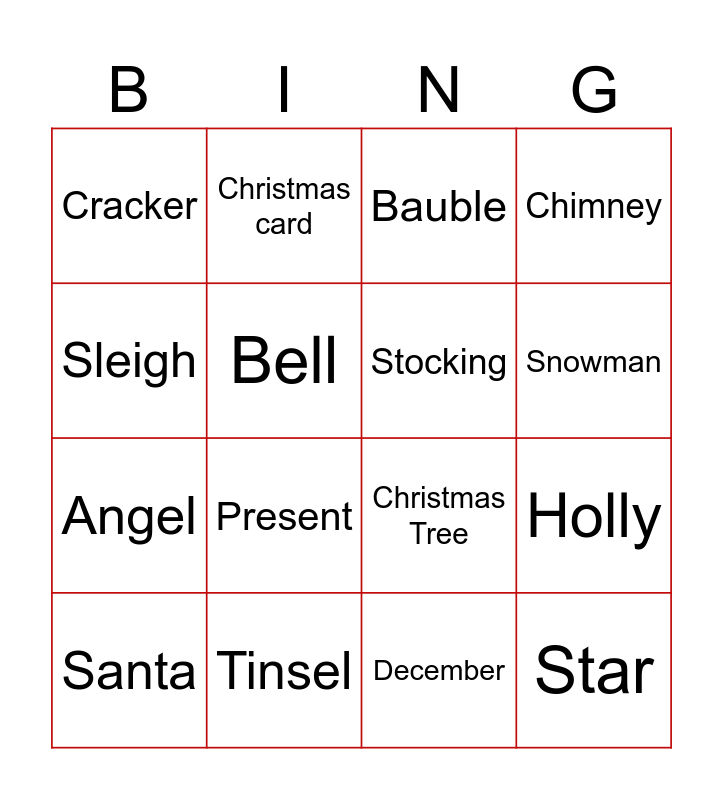 This bingo card has 19 words: Christmas Tree, Snowflake, Bauble, Star, Holly, Sleigh, December, Cracker, Christmas card, Angel, Present, Bell, Stocking, Tinsel, Santa, Reindeer, Chimney, Snowman and Elf.