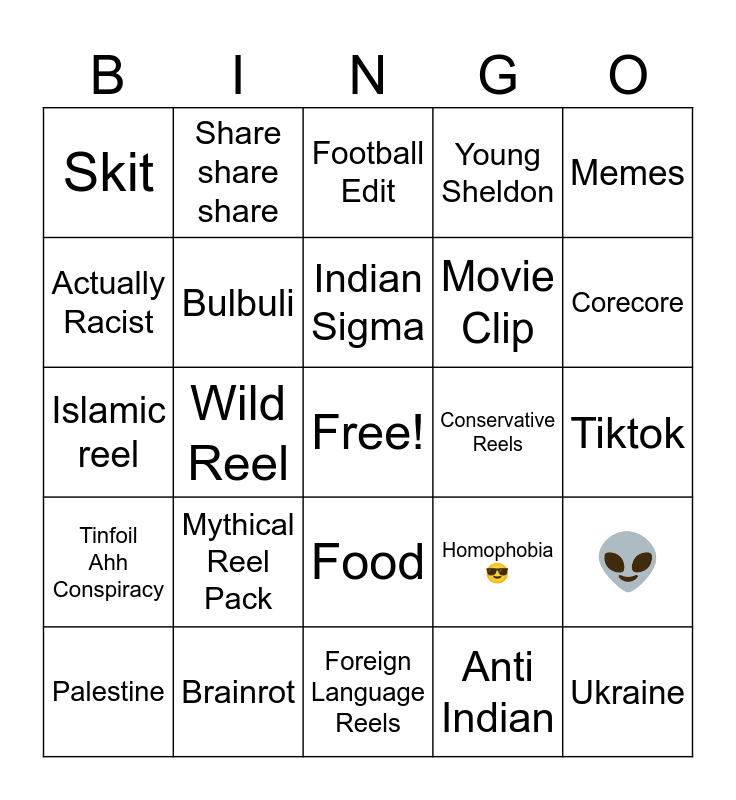 This bingo card has a free space and 24 words: Mythical Reel Pack, Brainrot, Indian Sigma, Palestine, Memes, Skit, Actually Racist, Share share share, Conservative Reels, Food, Movie Clip, Islamic reel, Homophobia 😎, 👽, Bulbuli, Anti Indian, Tiktok, Football Edit, Corecore, Wild Reel, Ukraine, Tinfoil Ahh Conspiracy, Young Sheldon and Foreign Language Reels.