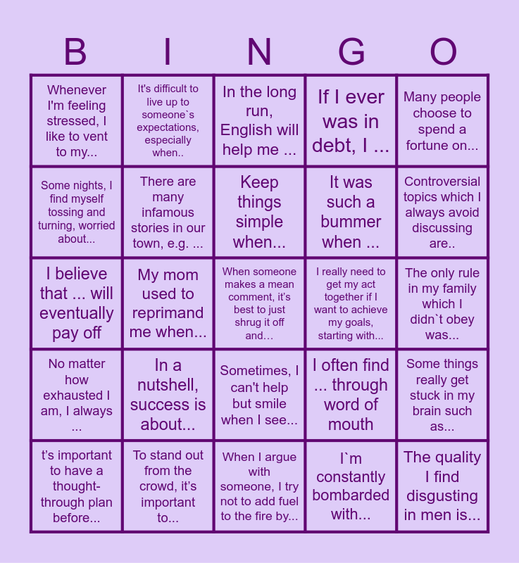 This bingo card has a free space and 24 words: In a nutshell, success is about..., To stand out from the crowd, it’s important to..., Keep things simple when..., t’s important to have a thought-through plan before..., Many people choose to spend a fortune on..., Whenever I'm feeling stressed, I like to vent to my..., Some nights, I find myself tossing and turning, worried about..., It's difficult to live up to someone`s expectations, especially when.., I really need to get my act together if I want to achieve my goals, starting with..., Sometimes, I can't help but smile when I see..., It was such a bummer when ..., I believe that ... will eventually pay off, I often find ... through word of mouth, Some things really get stuck in my brain such as..., There are many infamous stories in our town, e.g. ..., I`m constantly bombarded with..., The only rule in my family which I didn`t obey was..., In the long run, English will help me ..., Controversial topics which I always avoid discussing are.., My mom used to reprimand me when..., The quality I find disgusting in men is..., No matter how exhausted I am, I always ..., If I ever was in debt, I ... and When I argue with someone, I try not to add fuel to the fire by....