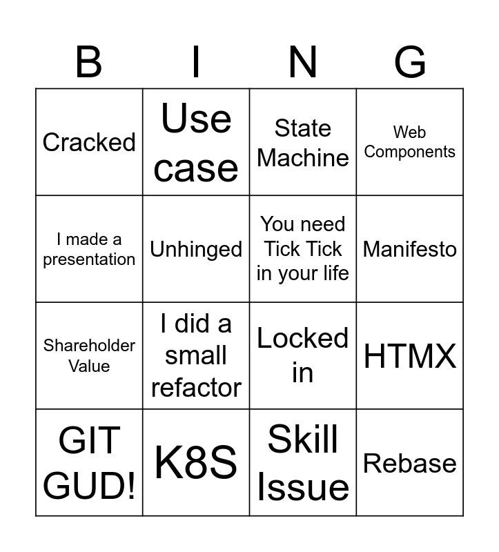 This bingo card has 16 words: K8S, HTMX, State Machine, Cracked, Shareholder Value, Use case, Locked in, Skill Issue, I made a presentation, Unhinged, GIT GUD!, Web Components, I did a small refactor, Manifesto, You need Tick Tick in your life and Rebase.