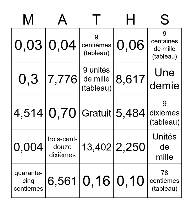 This bingo card has a free space and 59 words: 9 unités (tableau), 6,561, 16,402, 9 dizaines (tableau), Unités de mille, 9 centaines (tableau), 7,776, 823,543, 5,484, 6,463, 0,3, 0,2, 8,617, 2,520, 3,503, 0,04, 9 unités de mille (tableau), 0,06, 0,010, 4,514, 0,70, 9 centièmes (tableau), 9 dizaines (tableau), 9 dixièmes (tableau), 9 millièmes (tableau), 6,516, 13,402, 9 dizaines de mille (tableau), 9 centaines de mille (tableau), 9 millions (tableau), 7,767, 825,343, 5,844, 6,473, 0,03, 0,002, 8.617, 2,250, 3.503, 0,004, 0,05, 0,16, 0,10, 4.514, 0,070, Virgule, 0,09, Valeurs de position, Une demie, quarante-cinq centièmes, quatre-vingt cinq centièmes, quarante-cinq millièmes, 78 dixièmes (tableau), 78 centièmes (tableau), 78 millièmes (tableau), trois-cent-douze dixièmes, trois-cent-douze centièmes, trois-cent-douze milliémes and Vive la math!.