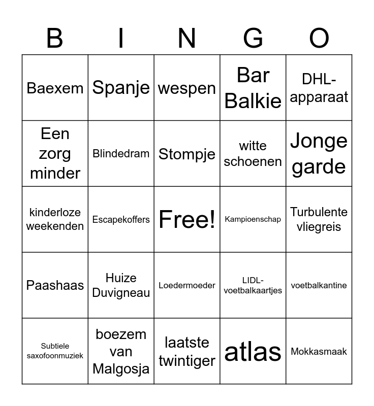 This bingo card has a free space and 39 words: Daghoroscoop, Erotisch avontuur, Sharky Grey, Blindedram, Subtiele saxofoonmuziek, Loedermoeder, Stompje, 203 foto’s, DHL-apparaat, Paashaas, Escapekoffers, Bar Balkie, Mokkasmaak, Turbulente vliegreis, Kampioenschap, Huize Duvigneau, Kraanwater, Baexem, e-choppen en volproppen, LIDL-voetbalkaartjes, Een zorg minder, laatste twintiger, witte schoenen, Jonge garde, tokkiecamping, Hu camping, Slak Gerrit, Zwembadduikje, Mieke heeft een lammetje, Spanje, Kroeg, vader van DJ DJim, wespen, boezem van Malgosja, atlas, tukje, voetbalkantine, kinderloze weekenden and gelukkig hebben we elkaar.