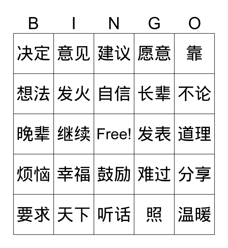 This bingo card has a free space and 24 words: 幸福, 天下, 自信, 要求, 靠, 决定, 想法, 意见, 发表, 鼓励, 长辈, 晚辈, 难过, 分享, 发火, 照, 道理, 建议, 不论, 继续, 温暖, 烦恼, 愿意 and 听话.