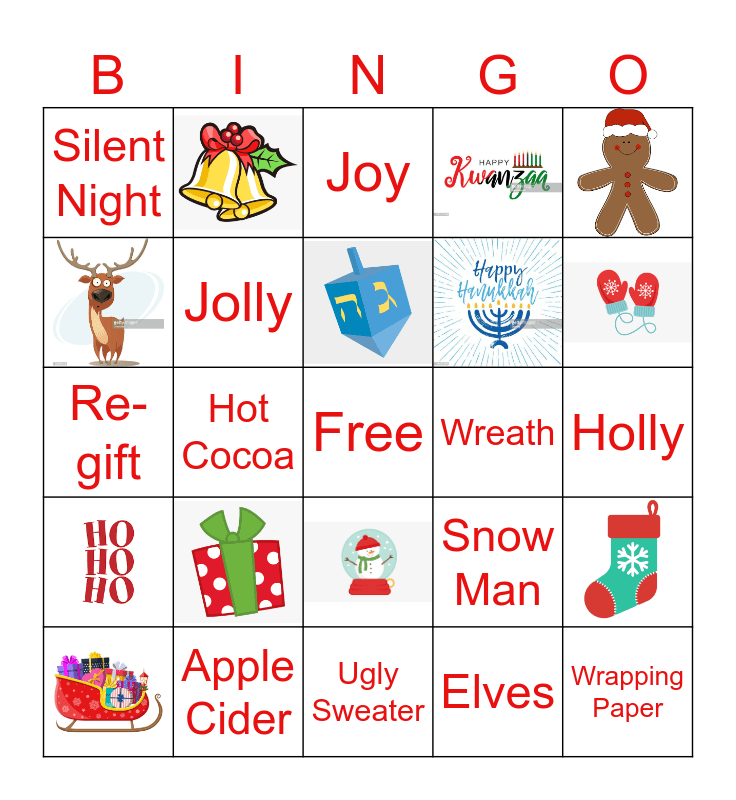 This bingo card has 17 images, a free space and 14 words: Ugly Sweater, Egg Nog, Hot Cocoa, Mistle Toe, Silent Night, Joy, Jolly, Snow Man, Wreath, Elves, Holly, Wrapping Paper, Re-gift and Apple Cider.