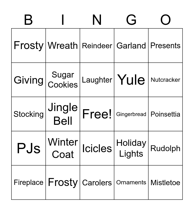 This bingo card has a free space and 45 words: Snowman, Mistletoe, Snowflake, Fireplace, Sleigh, Ornaments, Reindeer, Hot Cocoa, Presents, Frosty, Garland, Gingerbread, Icicles, Winter Coat, Snowball, Carolers, Ice Skating, Stocking, Chimney, Nutcracker, Wreath, Candy Cane, Mantle, Frosty, Tinsel, Poinsettia, Roast Beast, Polar Express, Holiday Lights, PJs, Holly, Rudolph, Hat, Gloves, Scarf, Jingle Bell, Bow, Jolly, Family, Laughter, Giving, Yule, Feast, Sugar Cookies and Snow Globe.