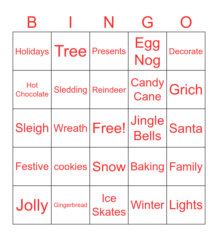 This bingo card has a free space and 24 words: cookies, Gingerbread, Reindeer, Jolly, Decorate, Holidays, Hot Chocolate, Tree, Jingle Bells, Snow, Candy Cane, Sleigh, Baking, Family, Sledding, Winter, Santa, Presents, Grich, Wreath, Lights, Festive, Egg Nog and Ice Skates.