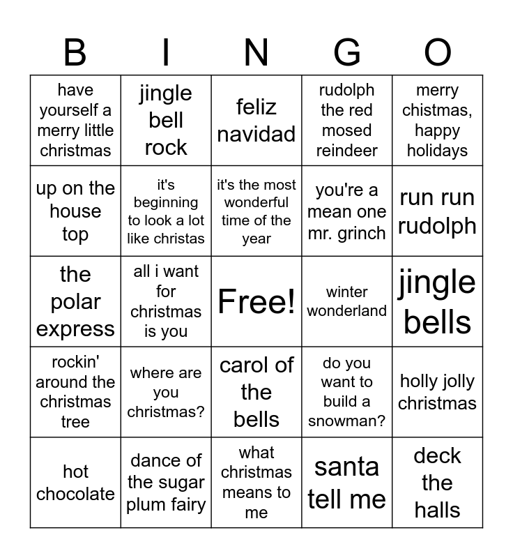 This bingo card has a free space and 32 words: santa tell me, underneath the tree, all i want for christmas is you, last christmas, rockin' around the christmas tree, it's beginning to look a lot like christas, merry chistmas, happy holidays, holly jolly christmas, jingle bell rock, let it snow! let it snow! let it snow!, it's the most wonderful time of the year, feliz navidad, santa clause is coming to town, sleigh ride, winter wonderland, let it go, hot chocolate, the polar express, carol of the bells, where are you christmas?, do you want to build a snowman?, frosty the snowman, jingle bells, dance of the sugar plum fairy, deck the halls, rudolph the red mosed reindeer, you're a mean one mr. grinch, up on the house top, have yourself a merry little christmas, what christmas means to me, i'll be home for christmas and run run rudolph.