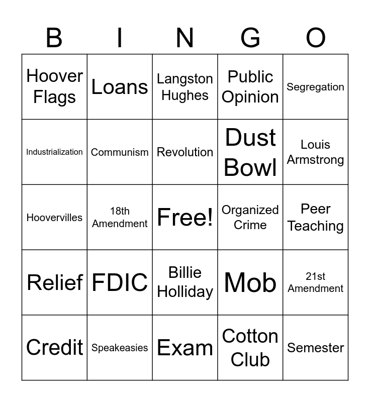 This bingo card has a free space and 34 words: First Attempts, Cotton Club, Debt, Bankrupt, Relief, Communism, Segregation, Credit, Loans, Recovery, Revolution, Langston Hughes, Lost Savings, Reform, Organized Crime, Louis Armstrong, Speakeasies, Hoovervilles, FDIC, Mob, Billie Holliday, Flappers, Hoover Flags, Peer Teaching, Exam, Semester, Public Opinion, Changes, Dust Bowl, Industrialization, Agrarian, 18th Amendment, 21st Amendment and Automobiles.