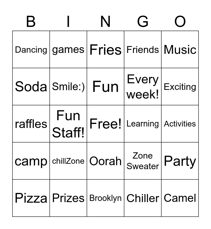 This bingo card has a free space and 24 words: chillZone, Prizes, Fun, Pizza, Music, Dancing, Soda, games, Learning, Oorah, Every week!, raffles, Zone Sweater, Party, Smile:), Chiller, Activities, Fries, Exciting, Fun Staff!, Camel, camp, Friends and Brooklyn.