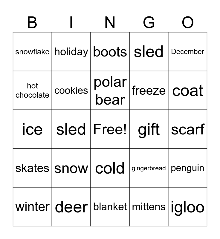 This bingo card has a free space and 24 words: snow, deer, polar bear, winter, December, snowflake, hot chocolate, holiday, gift, cold, freeze, ice, gingerbread, penguin, cookies, mittens, scarf, boots, coat, sled, igloo, skates, sled and blanket.