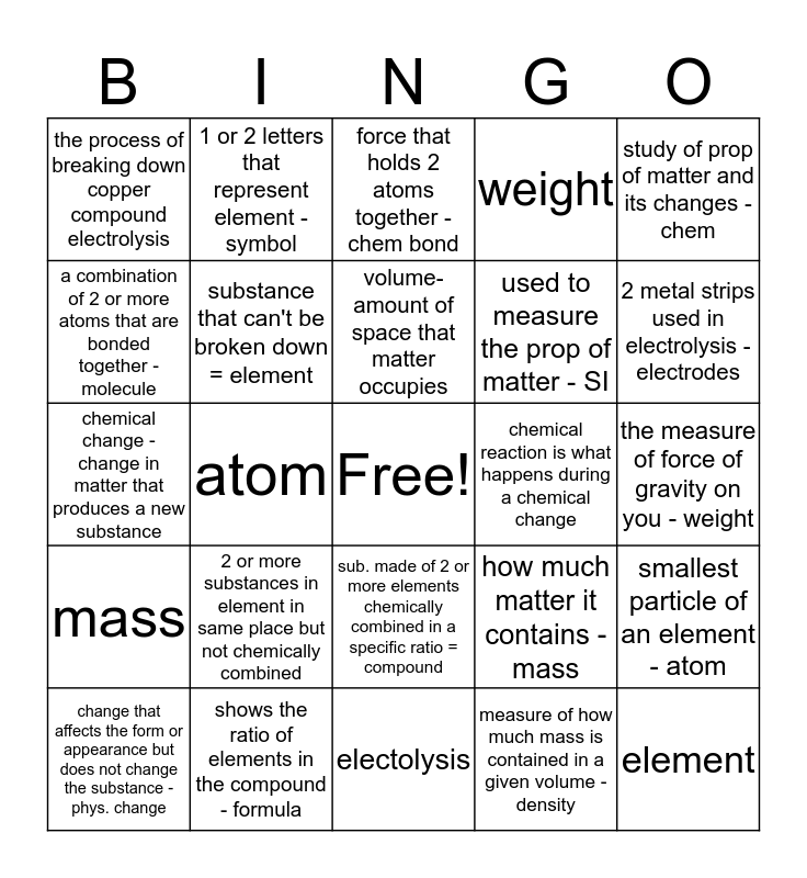 This bingo card has a free space and 24 words: 2 or more substances in element in same place but not chemically combined, shows the ratio of elements in the compound - formula, volume-amount of space that matter occupies, change that affects the form or appearance but does not change the substance - phys. change, study of prop of matter and its changes - chem, the process of breaking down copper compound electrolysis, a combination of 2 or more atoms that are bonded together - molecule, 1 or 2 letters that represent element - symbol, chemical reaction is what happens during a chemical change, sub. made of 2 or more elements chemically combined in a specific ratio = compound, used to measure the prop of matter - SI, chemical change - change in matter that produces a new substance, how much matter it contains - mass, smallest particle of an element - atom, substance that can't be broken down = element, measure of how much mass is contained in a given volume - density, the measure of force of gravity on you - weight, force that holds 2 atoms together - chem bond, 2 metal strips used in electrolysis - electrodes, atom, element, mass, weight and electolysis.