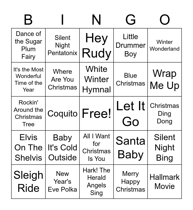 This bingo card has a free space and 25 words: Baby It's Cold Outside, Hark! The Herald Angels Sing, White Winter Hymnal, Sleigh Ride, Winter Wonderland, Dance of the Sugar Plum Fairy, It's the Most Wonderful Time of the Year, Silent Night Pentatonix, Let It Go, All I Want for Christmas Is You, Blue Christmas, Rockin' Around the Christmas Tree, Santa Baby, Silent Night Bing, Where Are You Christmas, White Christmas, Christmas Ding Dong, Hey Rudy, Wrap Me Up, Coquito, Hallmark Movie, New Year's Eve Polka, Elvis On The Shelvis, Little Drummer Boy and Merry Happy Christmas.