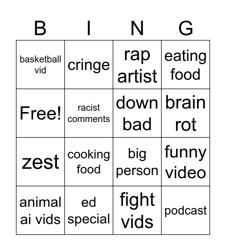 This bingo card has 16 words: ed special, funny video, rap artist, basketball vid, zest, cringe, big person, fight vids, Free!, racist comments, animal ai vids, eating food, cooking food, brain rot, down bad and podcast.