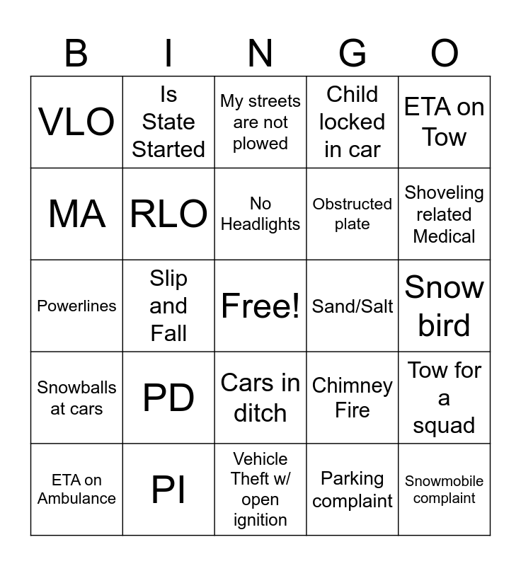 This bingo card has a free space and 24 words: PD, PI, No Headlights, ETA on Ambulance, ETA on Tow, VLO, MA, Is State Started, Sand/Salt, Cars in ditch, Obstructed plate, Powerlines, Chimney Fire, Tow for a squad, RLO, Parking complaint, Snow bird, My streets are not plowed, Shoveling related Medical, Slip and Fall, Snowmobile complaint, Snowballs at cars, Child locked in car and Vehicle Theft w/ open ignition.
