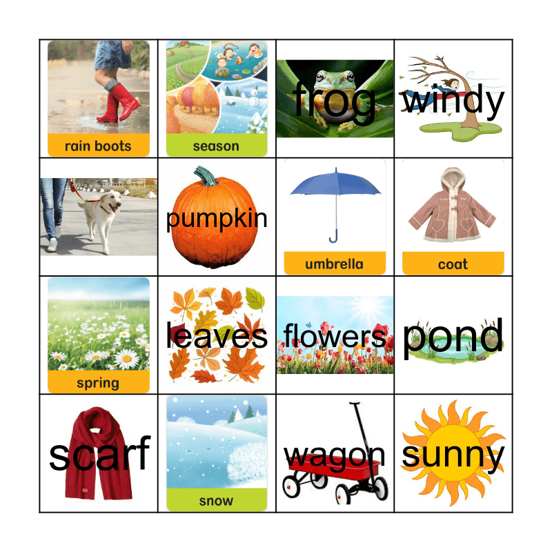This bingo card has 24 images and 12 words: pulling, pumpkin, flowers, sled, wagon, frog, leaves, pond, scarf, sunny, windy and flip flops.