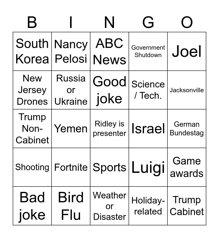 This bingo card has a free space and 24 words: Fortnite, Bird Flu, Good joke, Bad joke, Joel, South Korea, New Jersey Drones, Nancy Pelosi, Israel, Sports, Science / Tech., Trump Non-Cabinet, Luigi, Game awards, Russia or Ukraine, Holiday- related, German Bundestag, ABC News, Jacksonville, Yemen, Trump Cabinet, Shooting, Government Shutdown and Weather or Disaster.