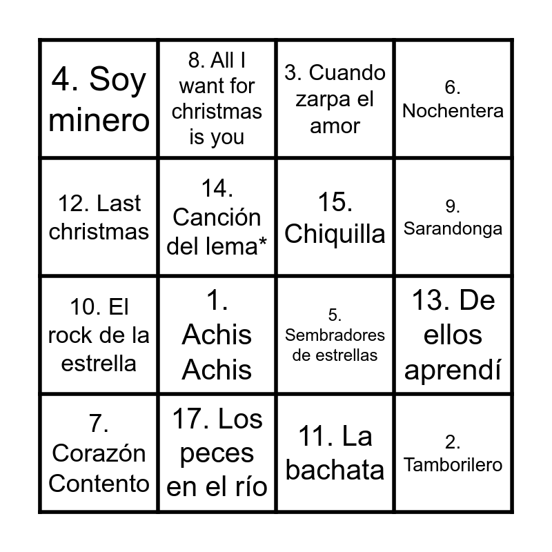 This bingo card has 18 words: 1. Achis Achis, 2. Tamborilero, 3. Cuando zarpa el amor, 4. Soy minero, 5. Sembradores de estrellas, 6. Nochentera, 7. Corazón Contento, 8. All I want for christmas is you, 9. Sarandonga, 10. El rock de la estrella, 11. La bachata, 12. Last christmas, 13. De ellos aprendí, 14. Canción del lema*, 15. Chiquilla, 16. Mi gran noche, 17. Los peces en el río and 18. Despechá.