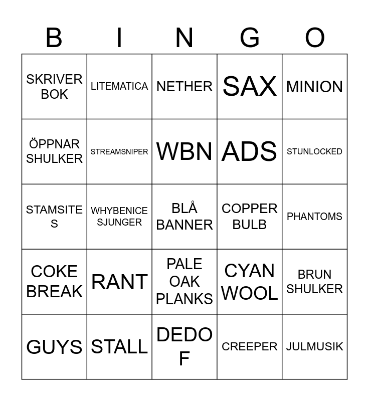 This bingo card has a free space and 24 words: RANT, STALL, WBN, GUYS, MINION, SKRIVER BOK, ÖPPNAR SHULKER, LITEMATICA, COPPER BULB, PALE OAK PLANKS, ADS, STAMSITE S, CYAN WOOL, BRUN SHULKER, STREAMSNIPER, CREEPER, PHANTOMS, NETHER, STUNLOCKED, WHYBENICE SJUNGER, JULMUSIK, COKE BREAK, SAX and DEDO F.