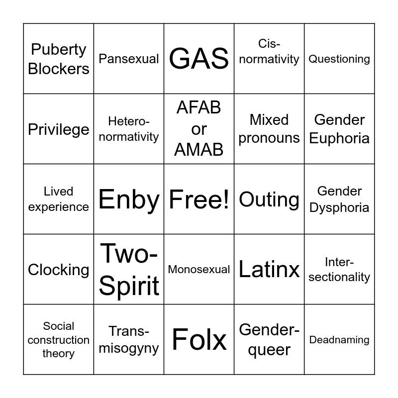This bingo card has a free space and 24 words: Two- Spirit, Trans-misogyny, AFAB or AMAB, Social construction theory, Questioning, Puberty Blockers, Privilege, Pansexual, Outing, Monosexual, Mixed pronouns, Lived experience, Latinx, Inter- sectionality, Hetero-normativity, Gender-queer, Gender Dysphoria, GAS, Gender Euphoria, Enby, Deadnaming, Clocking, Cis-normativity and Folx.
