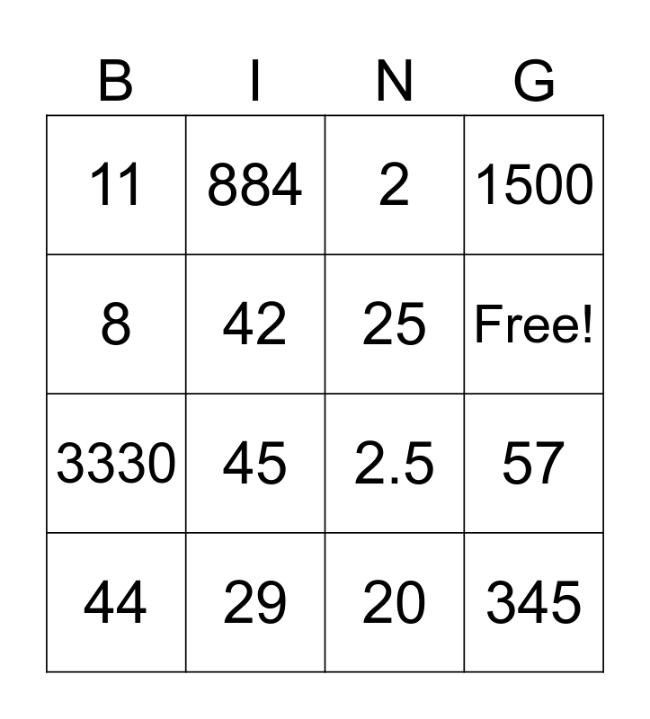 This bingo card has 17 words: 20, 44, 2, 11, 45, 1500, 57, 25, Free!, 42, 29, 2.5, 8, 884, 3330, 125 and 345.