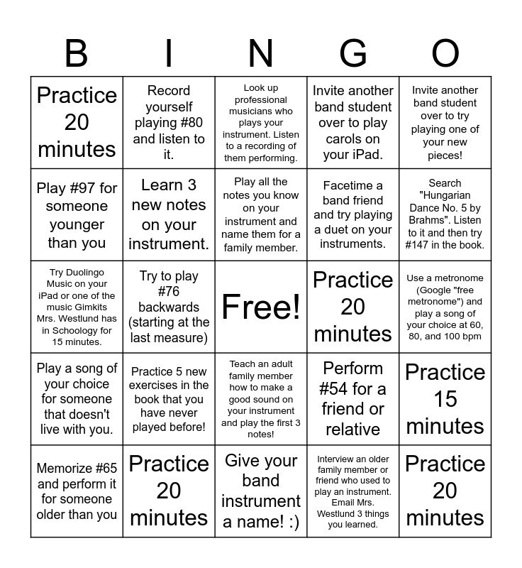 This bingo card has a free space and 24 words: Practice 5 new exercises in the book that you have never played before!, Practice 20 minutes, Play all the notes you know on your instrument and name them for a family member., Memorize #65 and perform it for someone older than you, Invite another band student over to try playing one of your new pieces!, Practice 20 minutes, Play #97 for someone younger than you, Record yourself playing #80 and listen to it., Practice 20 minutes, Teach an adult family member how to make a good sound on your instrument and play the first 3 notes!, Facetime a band friend and try playing a duet on your instruments., Try Duolingo Music on your iPad or one of the music Gimkits Mrs. Westlund has in Schoology for 15 minutes., Perform #54 for a friend or relative, Practice 15 minutes, Learn 3 new notes on your instrument., Interview an older family member or friend who used to play an instrument. Email Mrs. Westlund 3 things you learned., Use a metronome (Google "free metronome") and play a song of your choice at 60, 80, and 100 bpm, Look up professional musicians who plays your instrument. Listen to a recording of them performing., Search "Hungarian Dance No. 5 by Brahms". Listen to it and then try #147 in the book., Try to play #76 backwards (starting at the last measure), Practice 20 minutes, Play a song of your choice for someone that doesn't live with you., Invite another band student over to play carols on your iPad. and Give your band instrument a name! :).