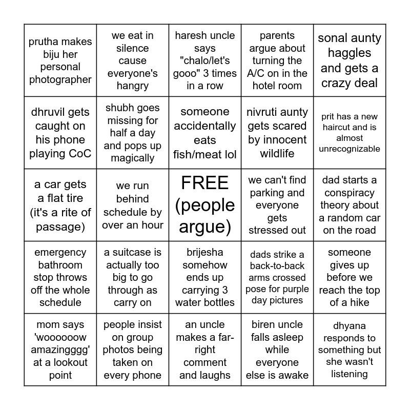 This bingo card has a free space and 32 words: biren uncle falls asleep while everyone else is awake, it rains and no one knows what to do, we run behind schedule by over an hour, we pile into a restaurant minutes before closing time, emergency bathroom stop throws off the whole schedule, shubh goes missing for half a day and pops up magically, sonal aunty haggles and gets a crazy deal, someone gives up before we reach the top of a hike, we eat in silence cause everyone's hangry, a dad mentions "we should've brought walkie talkies", someone accidentally eats fish/meat lol, haresh uncle says "chalo/let's gooo" 3 times in a row, the lead car takes a wrong turn and everyone follows, parents accuse each other of cheating while playing cards, we can't find parking and everyone gets stressed out, people hike in completely the wrong footwear, mom says 'woooooow amazingggg' at a lookout point, a car gets a flat tire (it's a rite of passage), brijesha somehow ends up carrying 3 water bottles, a suitcase is actually too big to go through as carry on, dads strike a back-to-back arms crossed pose for purple day pictures, someone forgot to wear or bring purple for purple day, dad starts a conspiracy theory about a random car on the road, people insist on group photos being taken on every phone, dhyana responds to something but she wasn't listening, parents argue about turning the A/C on in the hotel room, nivruti aunty gets scared by innocent wildlife, dhruvil gets caught on his phone playing CoC, prutha makes biju her personal photographer, an uncle makes a far-right comment and laughs, smit pulls out a massage gun and prit has a new haircut and is almost unrecognizable.