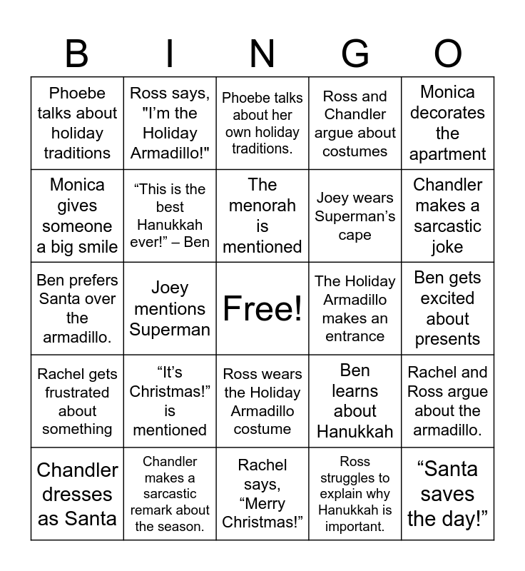 This bingo card has a free space and 39 words: Ross says, “Happy Hanukkah!”, “It’s the Holiday Armadillo!” – Ross, Joey says, “Superman to the rescue!”, “This is the best Hanukkah ever!” – Ben, Chandler dresses as Santa, Ross wears the Holiday Armadillo costume, The menorah is mentioned, Phoebe sings a holiday song, Monica decorates the apartment, Rachel gets frustrated about something, Joey mentions Superman, Ross and Chandler argue about costumes, “Santa saves the day!”, Ben gets excited about presents, The Holiday Armadillo makes an entrance, “It’s Christmas!” is mentioned, Someone laughs at Ross’s costume, Phoebe talks about holiday traditions, “Presents, presents, presents!”, Ben learns about Hanukkah, Monica gives someone a big smile, Rachel says, “Merry Christmas!”, Joey wears Superman’s cape, Chandler makes a sarcastic joke, Ross wears a Santa hat over his armadillo costume., Monica decorates everything "perfectly.", Joey is obsessed with the food., Chandler mocks Ross’s attempt to explain Hanukkah., Phoebe sings "Jingle Bells.", Ross says, "I’m the Holiday Armadillo!", Ben doesn’t understand the armadillo., Monica gives holiday gifts., Phoebe talks about her own holiday traditions., Chandler makes a sarcastic remark about the season., Ross struggles to explain why Hanukkah is important., Joey eats everything in sight., Rachel and Ross argue about the armadillo., Ben prefers Santa over the armadillo. and Chandler shares a joke about the holiday..