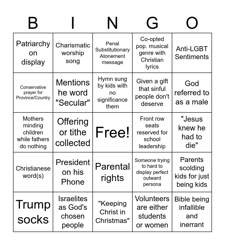 This bingo card has a free space and 25 words: President on his Phone, "Keeping Christ in Christmas", Hymn sung by kids with no significance them, Trump socks, Anti-LGBT Sentiments, Patriarchy on display, Conservative prayer for Province/Country, Charismatic worship song, Front row seats reserved for school leadership, Parental rights, Given a gift that sinful people don't deserve, Mothers minding children while fathers do nothing, Someone trying to hard to display perfect outward persona, Parents scolding kids for just being kids, Mentions he word "Secular", Nothing about welcoming in the homeless or immigrant, "Jesus knew he had to die", Penal Substitutionary Atonement message, God referred to as a male, Offering or tithe collected, Bible being infallible and inerrant, Israelites as God's chosen people, Christianese word(s), Co-opted pop. musical genre with Christian lyrics and Volunteers are either students or women.