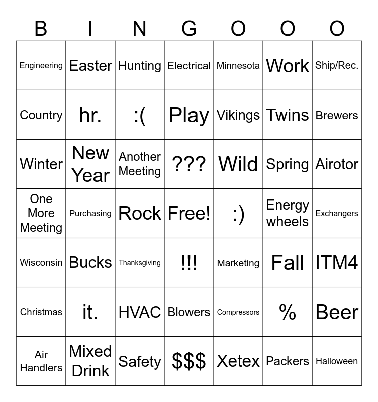 This bingo card has a free space and 55 words: Xetex, Airotor, Sales, Engineering, Purchasing, it., Ship/Rec., Manufacturing, hr., HVAC, Electrical, ITM4, Exchangers, Energy wheels, Air Handlers, Wisconsin, Minnesota, Vikings, Packers, Twins, Brewers, Bucks, Wild, Hunting, Fishing, Country, Rock, BBQ, Winter, Spring, Summer, Fall, Beer, Mixed Drink, Work, Play, Christmas, New Year, Halloween, Thanksgiving, Easter, Blowers, Compressors, Meeting, Another Meeting, One More Meeting, Safety, Marketing, :), :(, !!!, %, $$$, ??? and @.