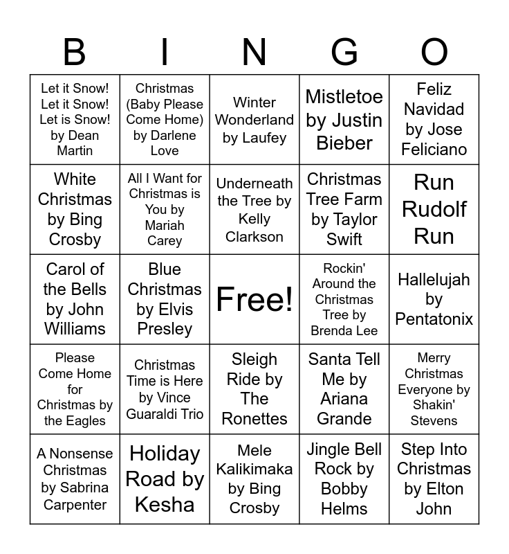 This bingo card has a free space and 34 words: Last Christmas by Wham!, Jingle Bell Rock by Bobby Helms, Holly Jolly Christmas by Michael Buble, It's Beginning to Look a Lot Like Christmas by Perry Como, Please Come Home for Christmas by the Eagles, All I Want for Christmas is You by Mariah Carey, Feliz Navidad by Jose Feliciano, A Nonsense Christmas by Sabrina Carpenter, Christmas (Baby Please Come Home) by Darlene Love, Have Yourself a Merry Little Christmas by Frank Sinatra, Underneath the Tree by Kelly Clarkson, Winter Wonderland by Laufey, Snowman by Sia, Wonderful Christmastime by Paul McCartney, Rockin' Around the Christmas Tree by Brenda Lee, Run Rudolf Run, Holiday Road by Kesha, Carol of the Bells by John Williams, Christmas Time is Here by Vince Guaraldi Trio, Santa Tell Me by Ariana Grande, Sleigh Ride by The Ronettes, It's the Most Wonderful Time of the Year by Andy WIlliams, Let it Snow! Let it Snow! Let is Snow! by Dean Martin, Hallelujah by Pentatonix, Mele Kalikimaka by Bing Crosby, Step Into Christmas by Elton John, Mistletoe by Justin Bieber, Little Saint Nick by The Beach Boys, Christmas Tree Farm by Taylor Swift, White Christmas by Bing Crosby, Santa Claus is Comin' to Town by Bruce Springsteen, Blue Christmas by Elvis Presley, Merry Christmas Everyone by Shakin' Stevens and Thank God its Christmas by Queen.