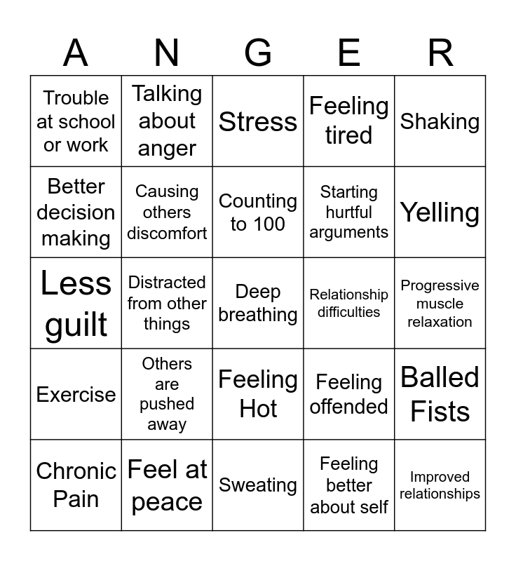 This bingo card has a free space and 24 words: Others are pushed away, Feel at peace, Counting to 100, Chronic Pain, Shaking, Trouble at school or work, Better decision making, Talking about anger, Relationship difficulties, Feeling Hot, Starting hurtful arguments, Less guilt, Feeling offended, Balled Fists, Causing others discomfort, Feeling better about self, Progressive muscle relaxation, Stress, Yelling, Distracted from other things, Improved relationships, Exercise, Feeling tired and Sweating.