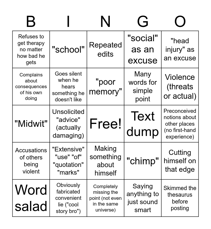 This bingo card has a free space and 24 words: "Extensive" "use" "of" "quotation" "marks", Obviously fabricated convenient lie ("cool story bro"), "poor memory", Word salad, "head injury" as an excuse, Refuses to get therapy no matter how bad he gets, Complains about consequences of his own doing, "school", Text dump, Making something about himself, Many words for simple point, "Midwit", "chimp", Cutting himself on that edge, Goes silent when he hears something he doesn't like, Saying anything to just sound smart, Preconceived notions about other places (no first-hand experience), Repeated edits, Violence (threats or actual), Unsolicited "advice" (actually damaging), Skimmed the thesaurus before posting, Accusations of others being violent, "social" as an excuse and Completely missing the point (not even in the same universe).