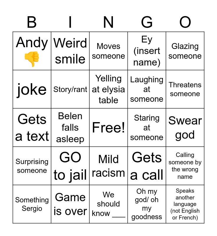 This bingo card has a free space and 24 words: GO to jail, Game is over, Yelling at elysia table, Something Sergio, Glazing someone, Andy👎, joke, Weird smile, Staring at someone, Mild racism, Laughing at someone, Gets a text, Gets a call, Calling someone by the wrong name, Story/rant, Oh my god/ oh my goodness, Swear god, Moves someone, Threatens someone, Belen falls asleep, Speaks another language (not English or French), Surprising someone, Ey (insert name) and We should know ___.
