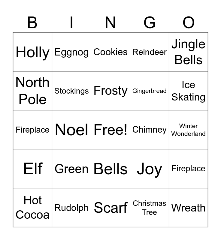 This bingo card has a free space and 60 words: Santa Claus, Rudolph, Snowman, Elf, Christmas Tree, Presents, Stockings, Candy Cane, Gingerbread, Sleigh, Reindeer, Snowflake, North Pole, Christmas Lights, Mistletoe, Holly, Wreath, Jingle Bells, Caroling, Frosty, Chimney, Cookies, Hot Cocoa, Fireplace, Ornaments, Tinsel, Toys, Polar Express, Ice Skating, Snowball, Nativity, Angels, Star, Grinch, Eggnog, Wrapping Paper, Sleigh Ride, Noel, Candy, Fireplace, Red, Green, Winter Wonderland, Silent Night, Joy, Peace, Holiday, Celebration, Peppermint, Bells, Scarf, Mittens, Tree Topper, Christmas Eve, Merry, Ho Ho Ho, Cookies for Santa, Snow Globe, Warm Blanket and Rudolph’s Nose.