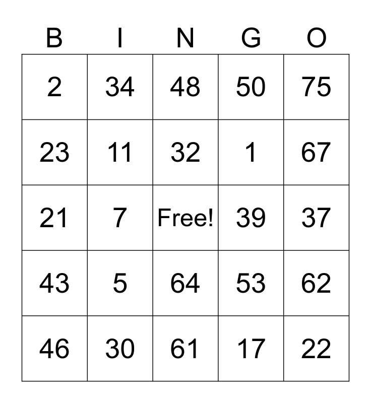 This bingo card has a free space and 24 words: 5, 30, 32, 46, 75, 2, 23, 34, 39, 64, 1, 21, 53, 62, 11, 17, 37, 48, 67, 7, 22, 43, 50 and 61.